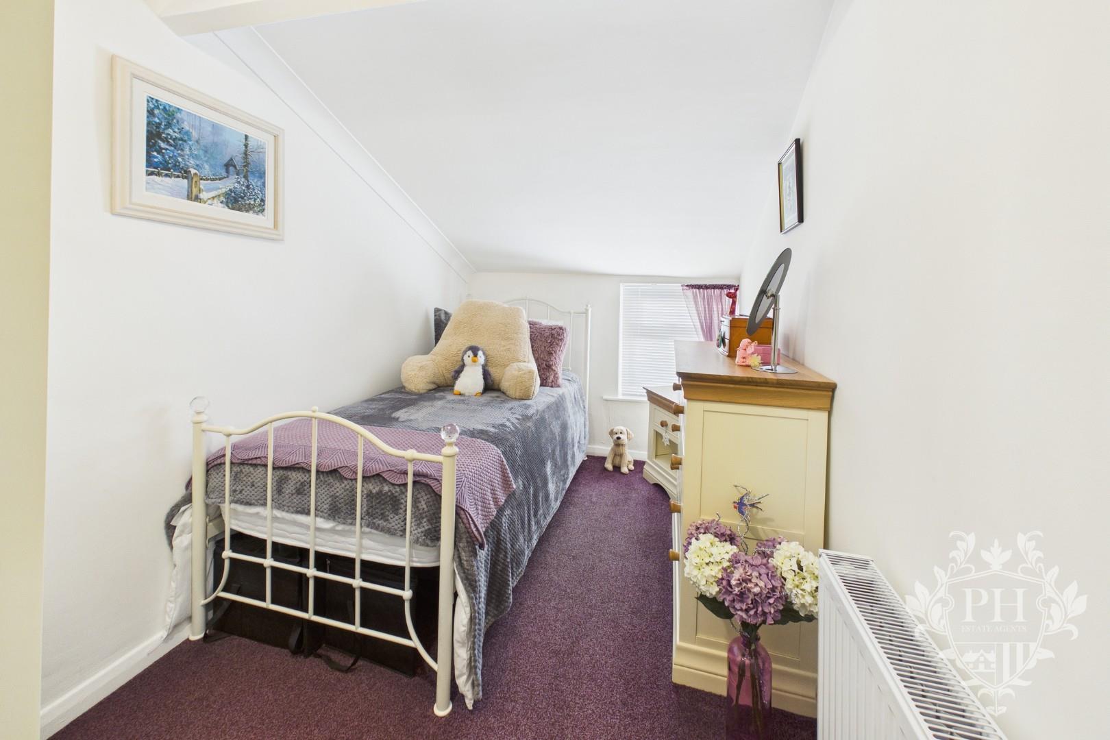 The second bedroom overlooks the front of the house, offering a bright and welcoming space. It easily accommodates a single bed, with plenty of room left over for extra storage. A large UPVC double glazed window lets in natural light while keeping things quiet and cozy, and the soft carpet underfoot adds a touch of comfort. There’s also a radiator to keep the room warm through the colder months.