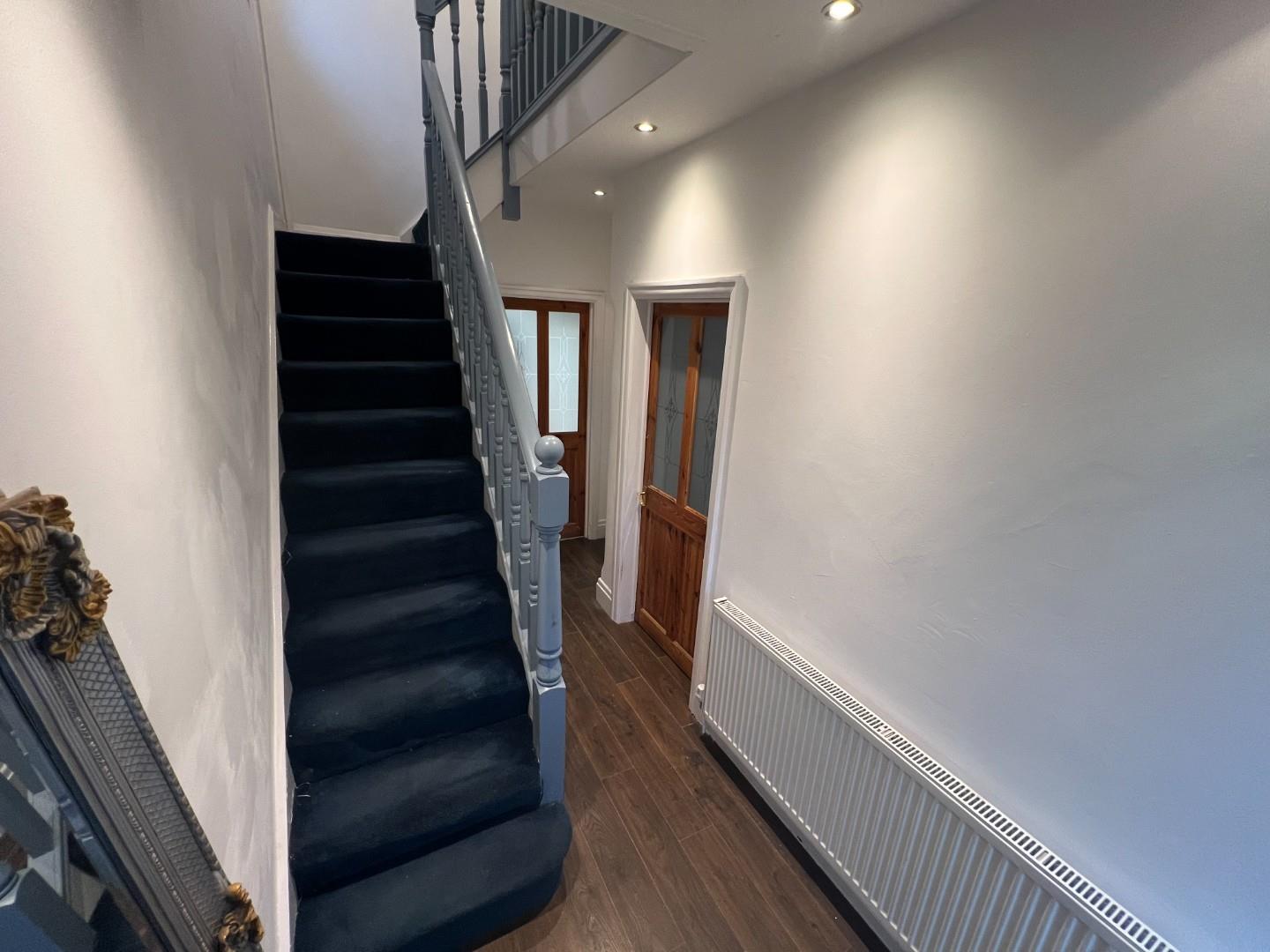 Step through the crisp white UPVC double-glazed door from the front garden and you’re welcomed into a bright, inviting hallway. Natural light pours in, bouncing off the sleek laminate flooring and highlighting the modern spotlights overhead. From here, you can easily access the spacious reception and dining area, the well-appointed kitchen, or head upstairs to the first floor. The hallway feels warm and comfortable, thanks to a neatly placed radiator that keeps the space cozy year-round.