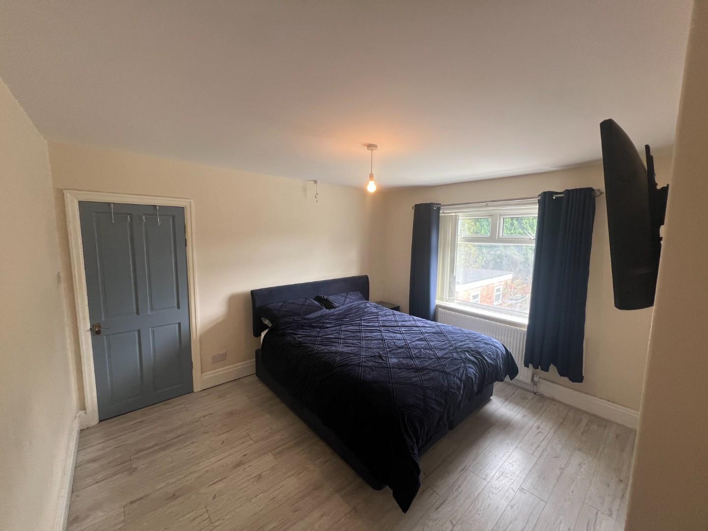 The first bedroom sits quietly at the back of the property, offering a generous layout that easily accommodates a double bed along with larger wardrobes or storage pieces. Sunlight filters through a modern UPVC double-glazed window, casting a gentle glow on the neutral-toned walls and sleek laminate flooring. A radiator ensures the room stays cozy year-round, making this space both comfortable and practical.
