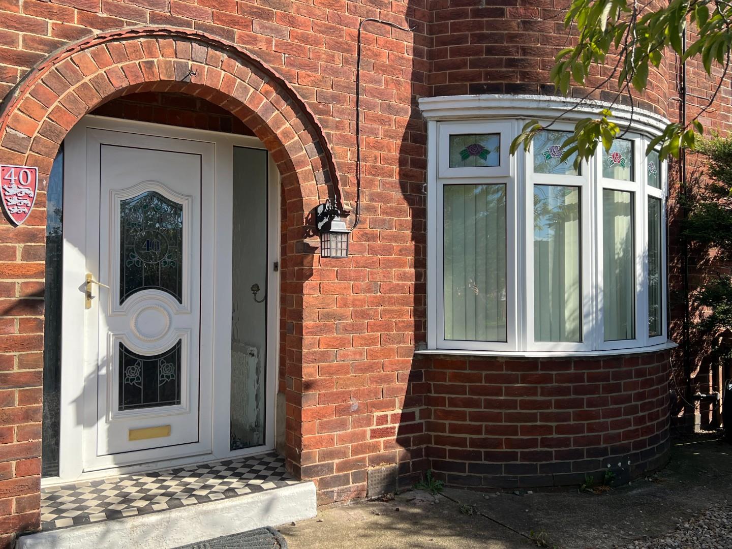 The kitchen is fitted with a generous selection of light-colored wall, base, and drawer units that create a bright, welcoming atmosphere. Rich wood-effect worktops provide a warm contrast to the cabinetry, adding visual interest and a touch of natural charm. There’s ample space for free-standing appliances, making the room as practical as it is attractive. A large UPVC double glazed window and matching door overlook the rear garden, filling the kitchen with natural light and offering easy access to the outdoor space.