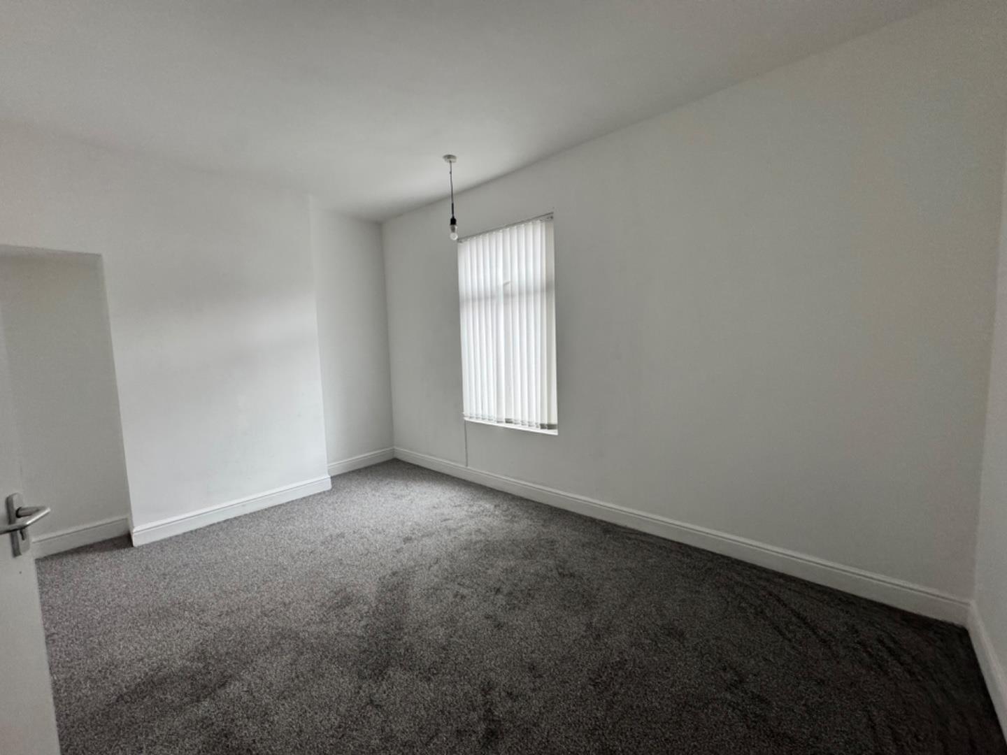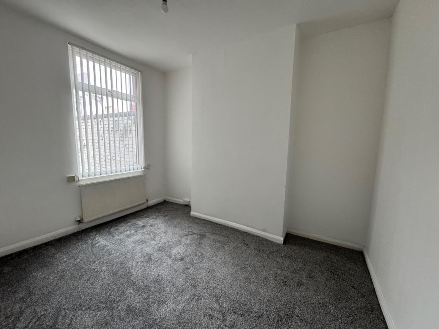 Mirroring the first, this room also boasts a grey carpet, a radiator, and clean white walls, with a generous window providing a view to the outside.