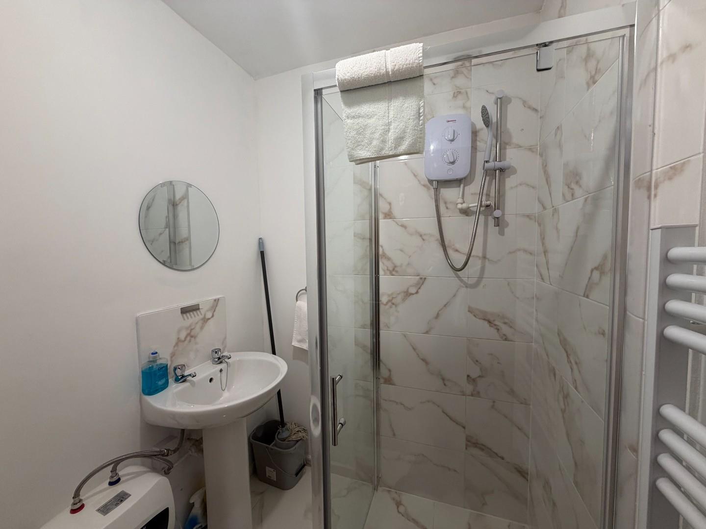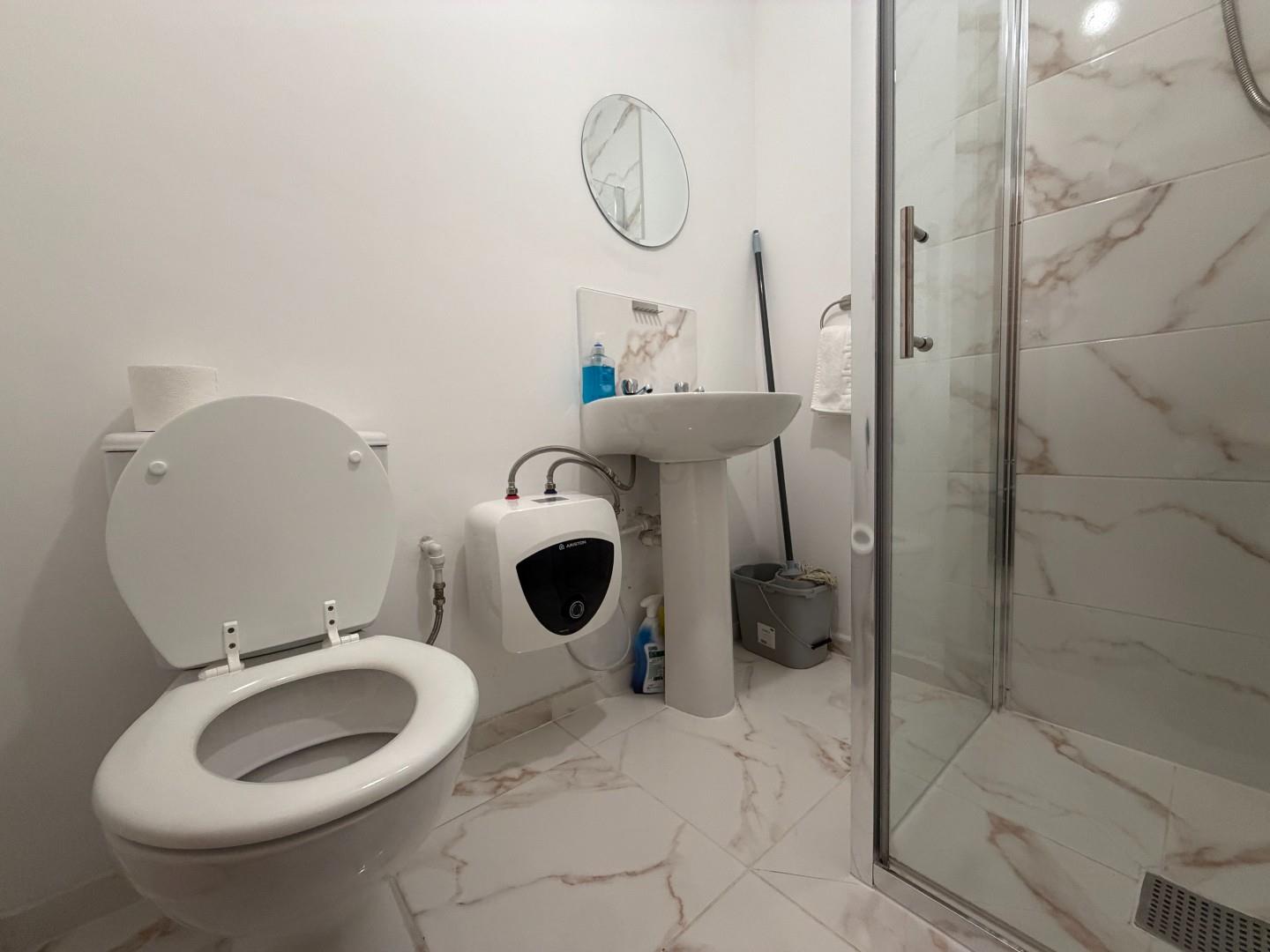 The modern shower room is finished with elegant marble-effect tiling and contemporary fixtures. It comprises a walk-in shower, WC, and wash basin, all presented in a clean and stylish design.