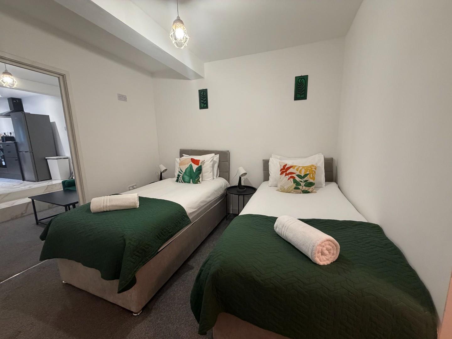 The stylish kitchen is finished to a high standard with sleek dark cabinetry and contrasting worktops. It is fully equipped with modern appliances including an oven, hob, extractor fan, fridge freezer, and washing machine. The layout is practical and spacious, with ample storage and preparation space.