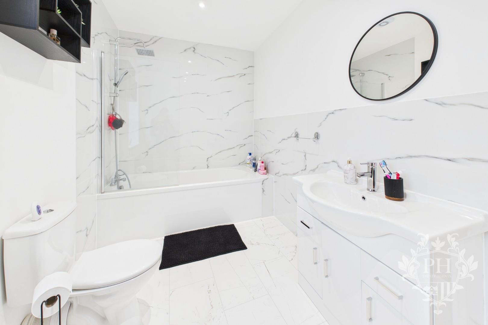 The bathroom features a stylish three-piece suite: a sleek panelled bathtub equipped with modern shower attachments and a clear glass screen, a spacious hand basin set atop generous storage cupboards, and a low-level toilet. The walls and ceiling are adorned with contemporary tiling that adds a fresh, polished feel to the space, while a gleaming chrome towel warmer provides both comfort and elegance. Natural light filters softly through a frosted UPVC double-glazed window, ensuring privacy without sacrificing brightness.