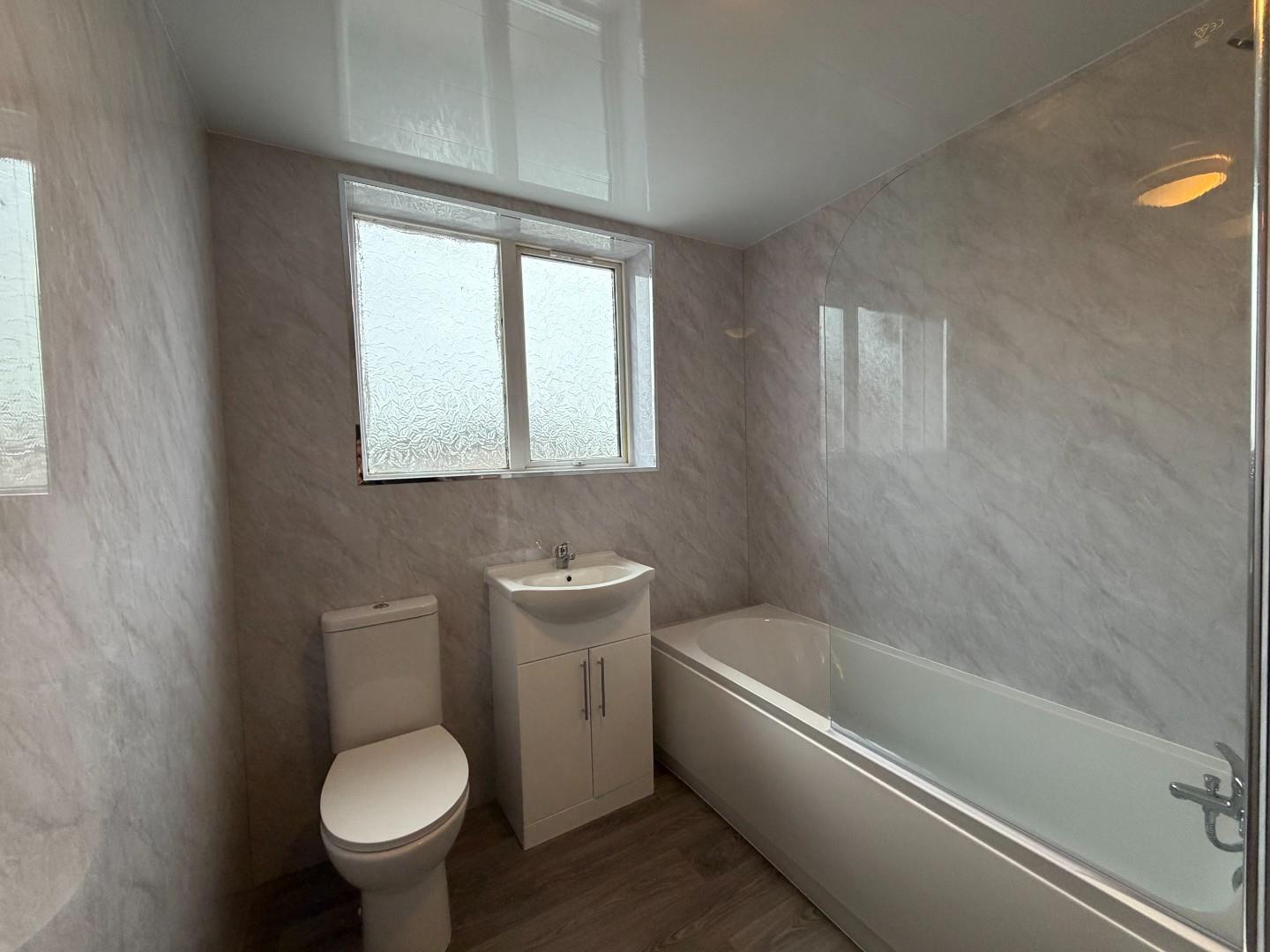 The modern family bathroom is fitted with a three-piece suite comprising panelled bath with shower and glass screen, wash hand basin with vanity storage, and low-level WC. Contemporary wall panelling, flooring, and a frosted window complete the space.