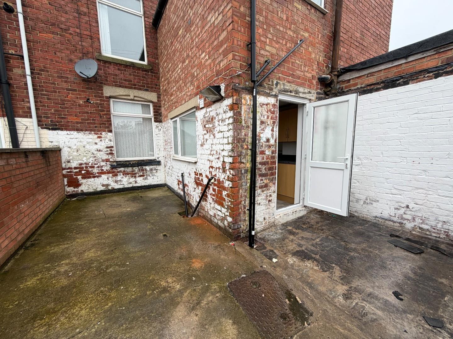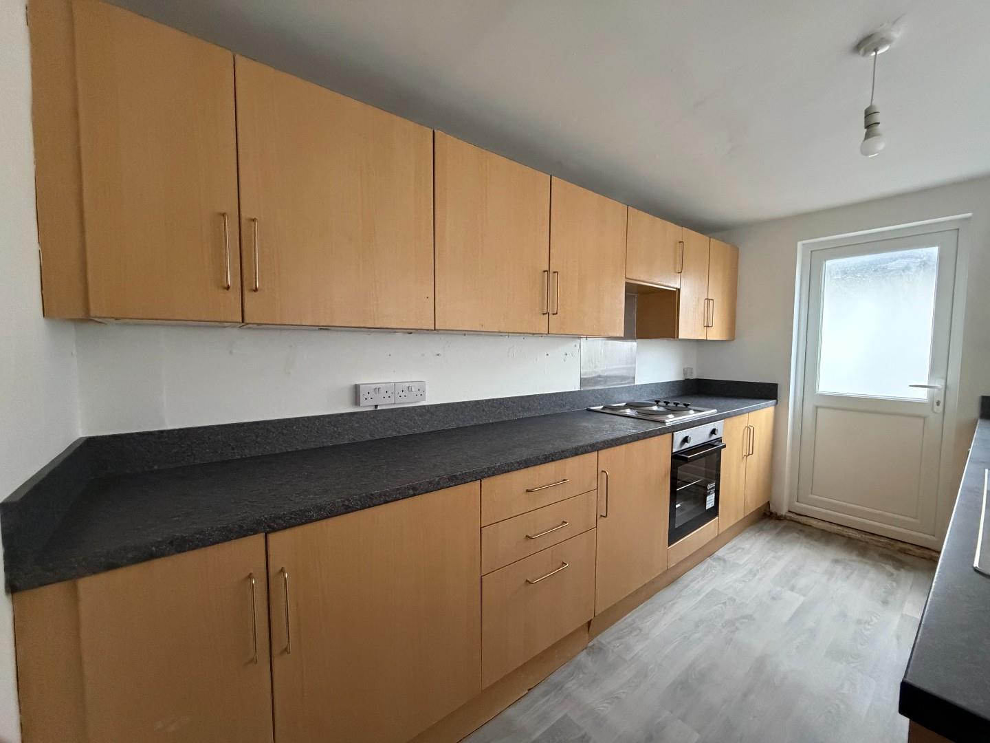 The fitted kitchen is arranged with a range of wall and base units, ample worktop space, stainless steel sink and drainer, integrated oven with electric hob, and space for additional appliances. A rear door provides direct access to the yard, and a large window ensures the space is bright and functional.
