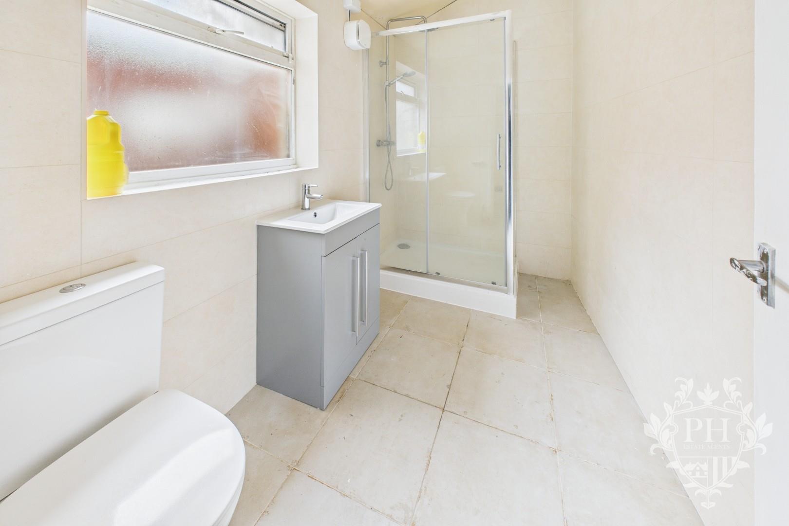 The family bathroom is located on the ground floor and features a well-appointed three-piece suite. At its center is a generously sized step-in shower with double doors and a thermostat control for comfortable water temperature. A spacious hand basin sits atop a sleek vanity unit, providing ample storage space beneath for toiletries and towels. The low level W.C. is positioned for convenience. The room is finished with matching floor and ceiling tiles, giving the space a polished, unified look. A frosted window lets in natural light while maintaining privacy, and a contemporary heated towel rail keeps towels warm and ready for use.
