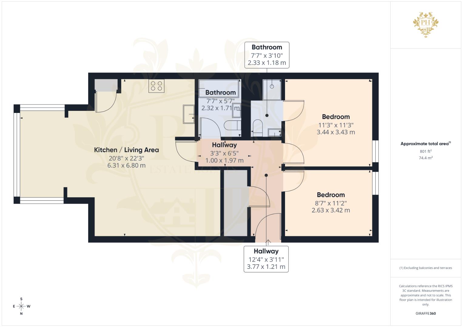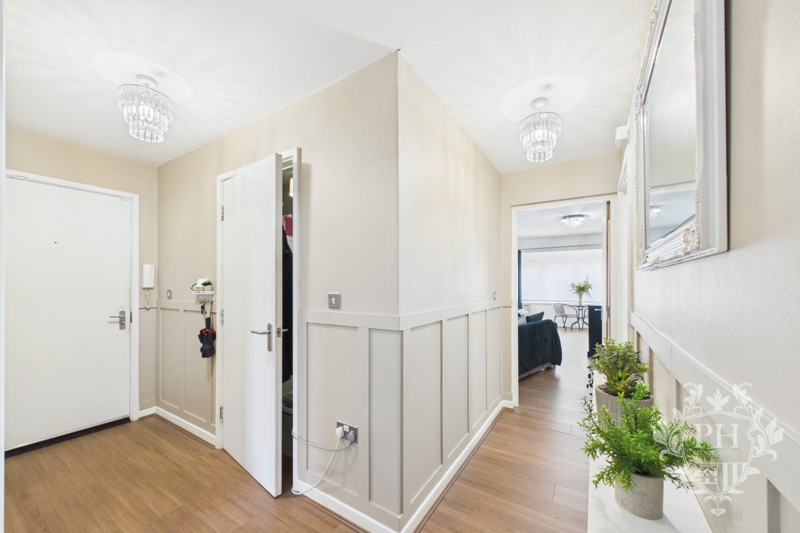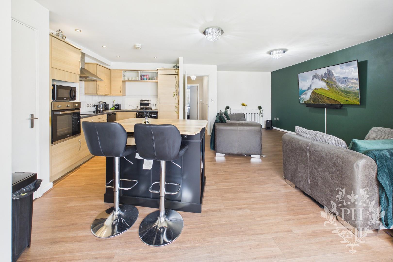Stepping in from the private parking area, you enter a secure communal hallway, designed with both safety and style in mind. The properties hallway itself is filled with natural light, highlighting its sleek, contemporary finishes. From the hallway you gain access to a spacious open-plan living area, two generously sized double bedrooms, a well-appointed family bathroom, and a convenient storage cupboard. In the main living space, modern laminate flooring stretches beneath your feet, complemented by crisp white walls and the warmth of a neatly installed radiator, creating a welcoming and comfortable atmosphere.
