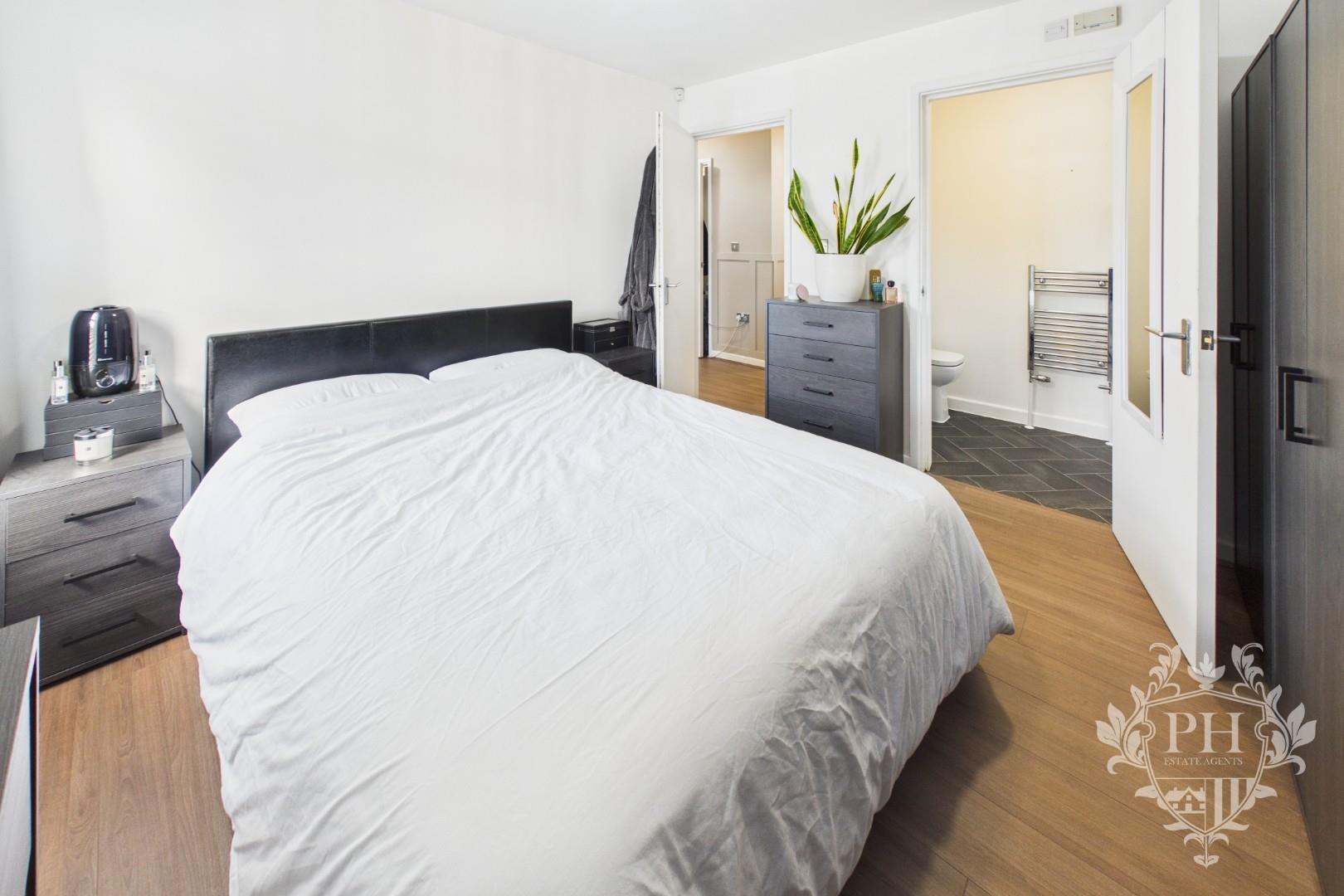 Tucked away at the back of the property, the first bedroom is impressively spacious, easily fitting a double bed with plenty of room left for larger storage pieces. Sunlight filters in through a sleek UPVC double glazed window, highlighting the clean lines of the modern laminate flooring. A radiator ensures comfort year-round, and the bedroom offers convenient direct access to a stylish en-suite bathroom.