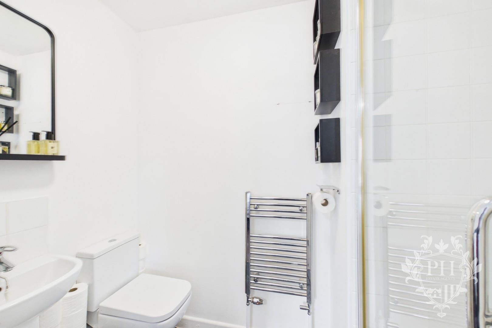 The en-suite features a contemporary three-piece suite, including a spacious step-in shower cubicle fitted with a sleek glass screen and a powerful shower. A modern hand basin sits beneath a well-lit mirror, offering both style and functionality, while the low-level w.c. blends seamlessly into the room’s clean design. Warmth is provided by a wall-mounted radiator, and the space is finished with stylish, modern flooring and crisp white walls that create a fresh, inviting atmosphere.
