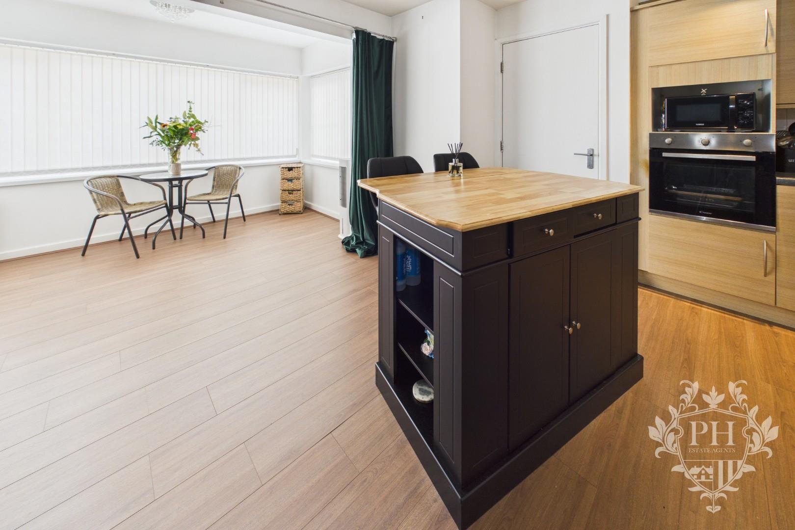 The dining area offers a generous sense of space, easily fitting a substantial dining table with room to spare for comfortable movement around it. A wide UPVC double-glazed bay window floods the room with natural light, creating a bright and inviting atmosphere, while a sleek radiator ensures warmth during colder months. The modern laminate flooring adds a stylish, contemporary touch that ties the whole space together.
