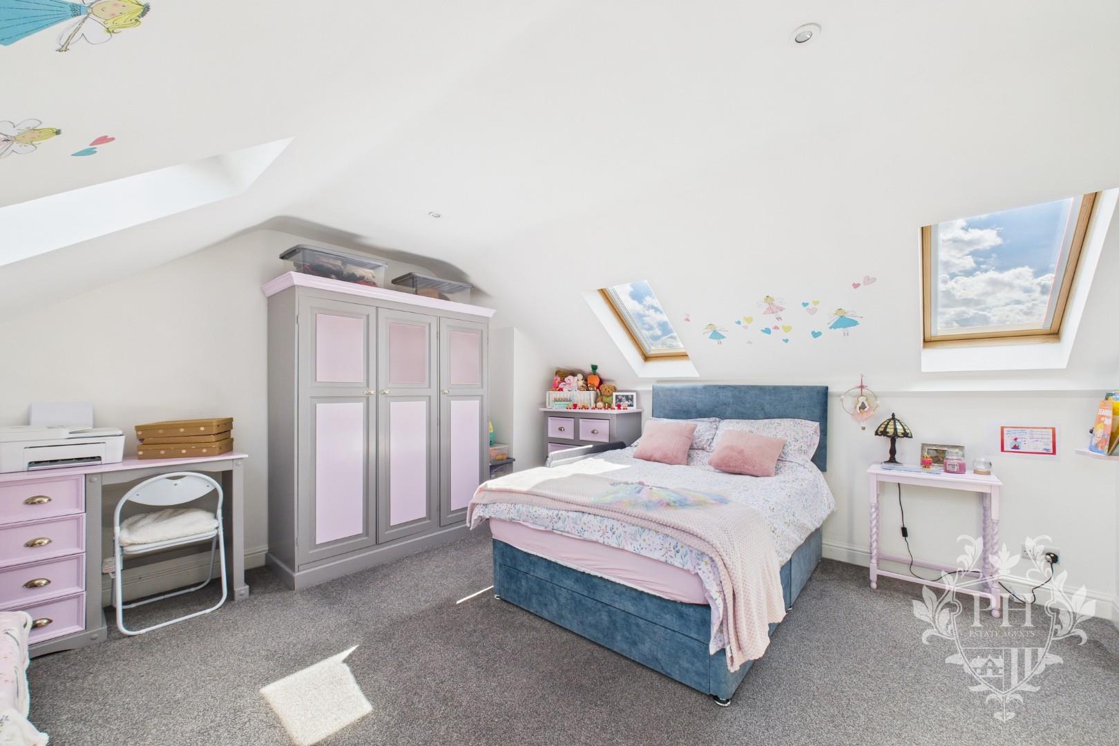 The first-floor bedroom is impressively spacious, designed to comfortably accommodate a double or king-size bed with plenty of room to spare for dressers, wardrobes, or other storage solutions. Four generous skylight windows flood the space with natural light during the day, creating a warm and inviting atmosphere against the freshly painted walls and plush carpeting underfoot. This bedroom also enjoys the convenience of direct access to the first-floor bathroom, making it both practical and private.