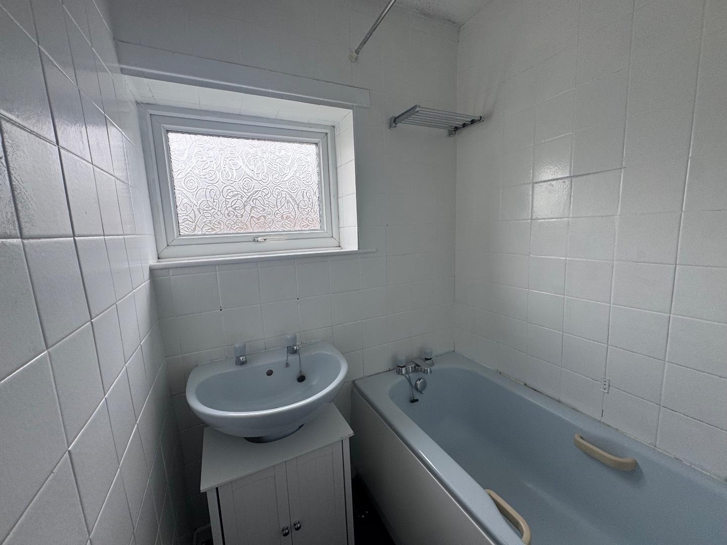 The bathroom benefits from modern grey lino, a pale blue 2 piece bathroom suite, frosted UPVC double glazed window & white tiling.