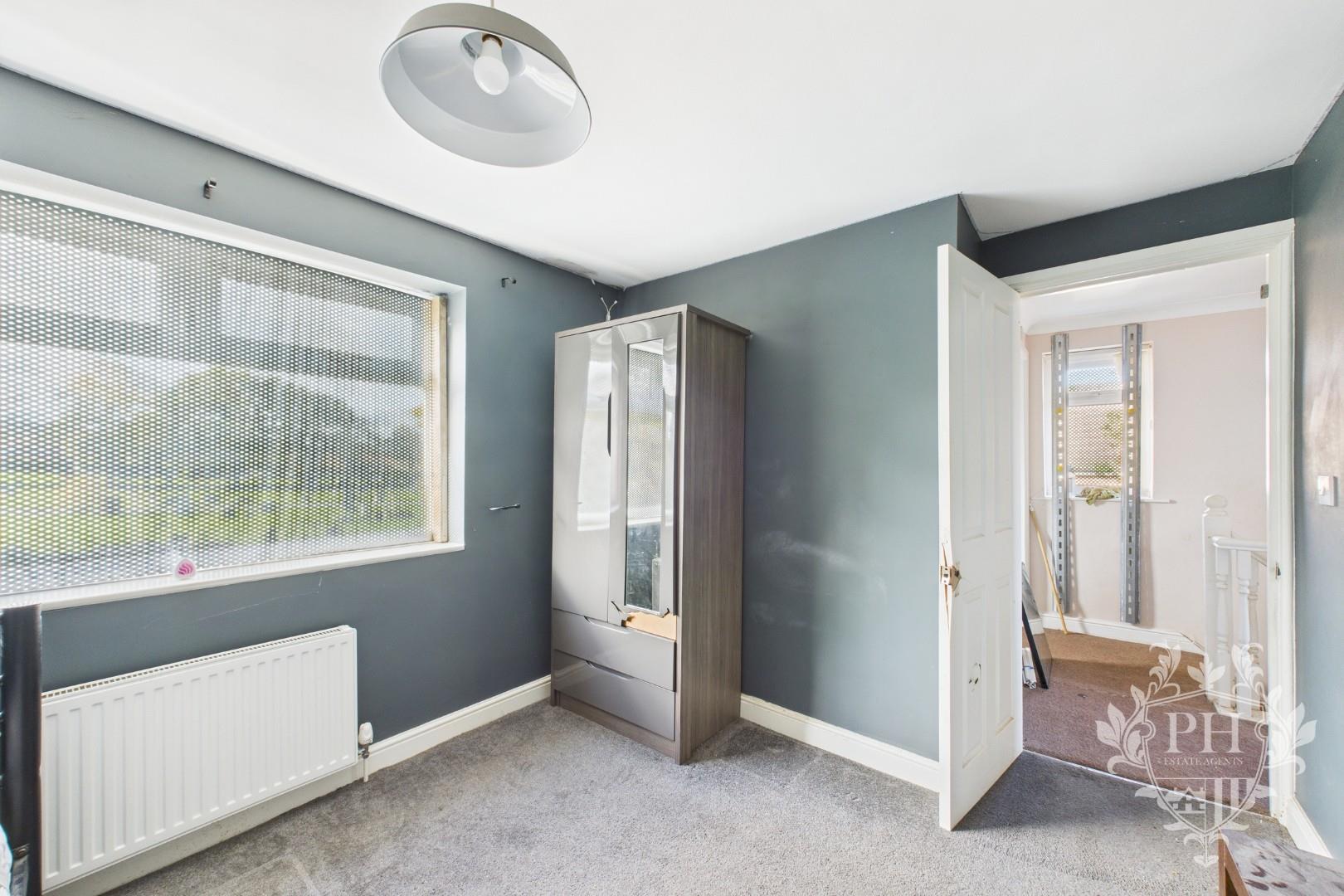 The first bedroom sits at the front of the house, offering enough room for a double bed and bedside tables on either side. Built-in wardrobes provide practical storage, while a large window lets in plenty of daylight. A radiator beneath the window keeps the space warm and comfortable.