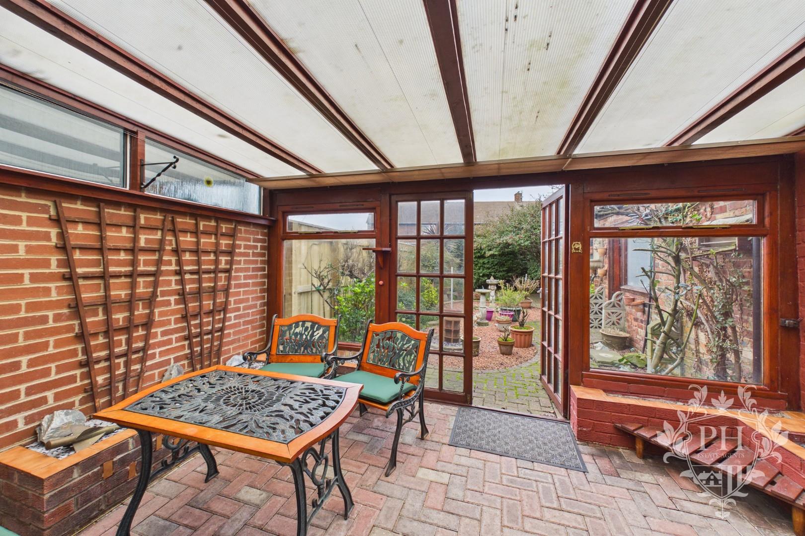 The property features a neat, and low-maintenance front garden bordered by a classic brick wall, creating a welcoming first impression. A shared driveway extends alongside the house, providing easy access to a longer than average brick garage—ideal for both parking and storage. At the back, you’ll find a generous block-paved garden designed for minimal upkeep, accented by established shrubs that bring a touch of greenery. A practical shed sits at the far end, perfect for storing tools or outdoor equipment.