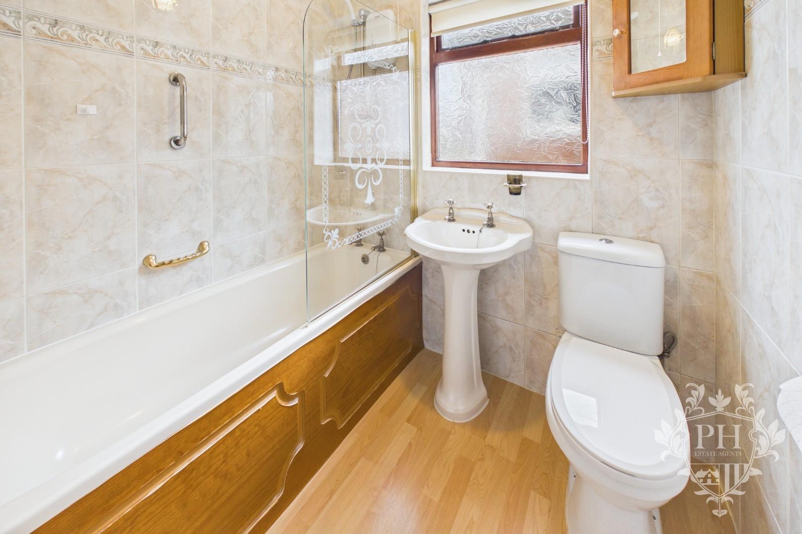 The tiled family bathroom features a classic three-piece suite, including a panelled bathtub fitted with an electric shower and a clear glass screen for effortless bathing. A hand basin sits nearby, complemented by a low-level toilet. Natural light filters in gently through a frosted window, preserving privacy while brightening the space. A radiator ensures the room stays warm and comfortable, while the laminate flooring provides both durability and a clean, contemporary look.