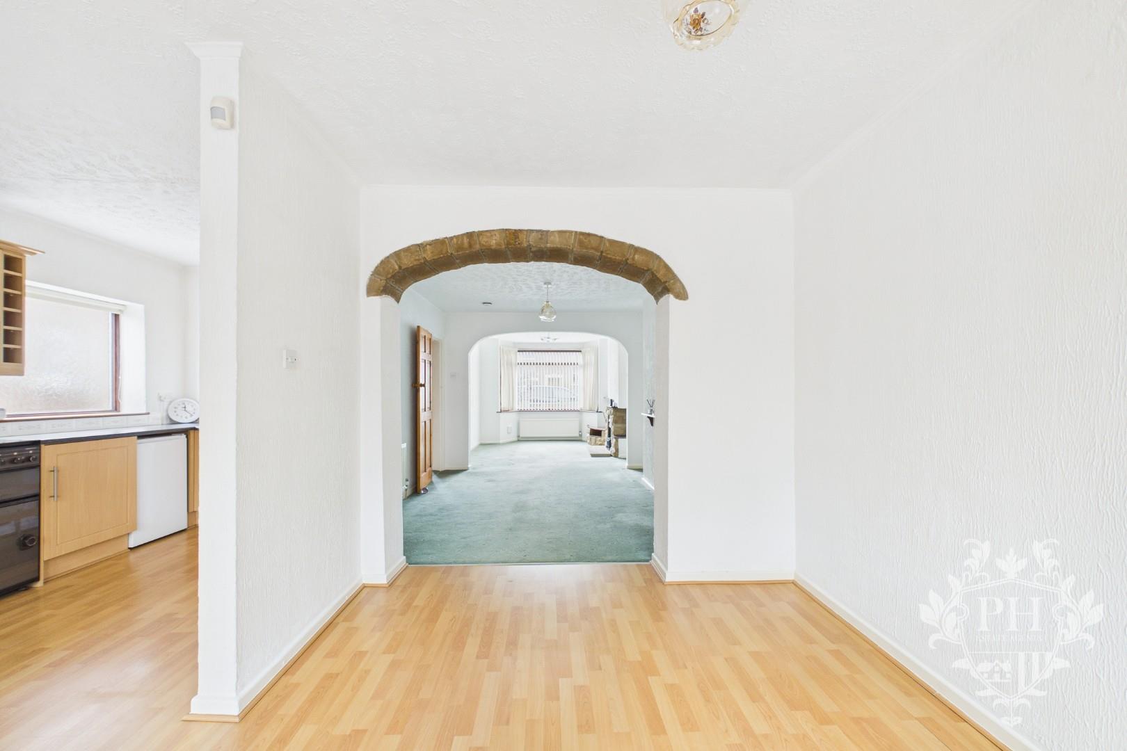 An elegant archway leads directly into the kitchen which is lined with a generous selection of light wood-effect cabinets—wall-mounted, base, and drawers all adding a modern but homely feel to the space. Dark countertops provide a striking contrast, offering plenty of space for meal preparation.