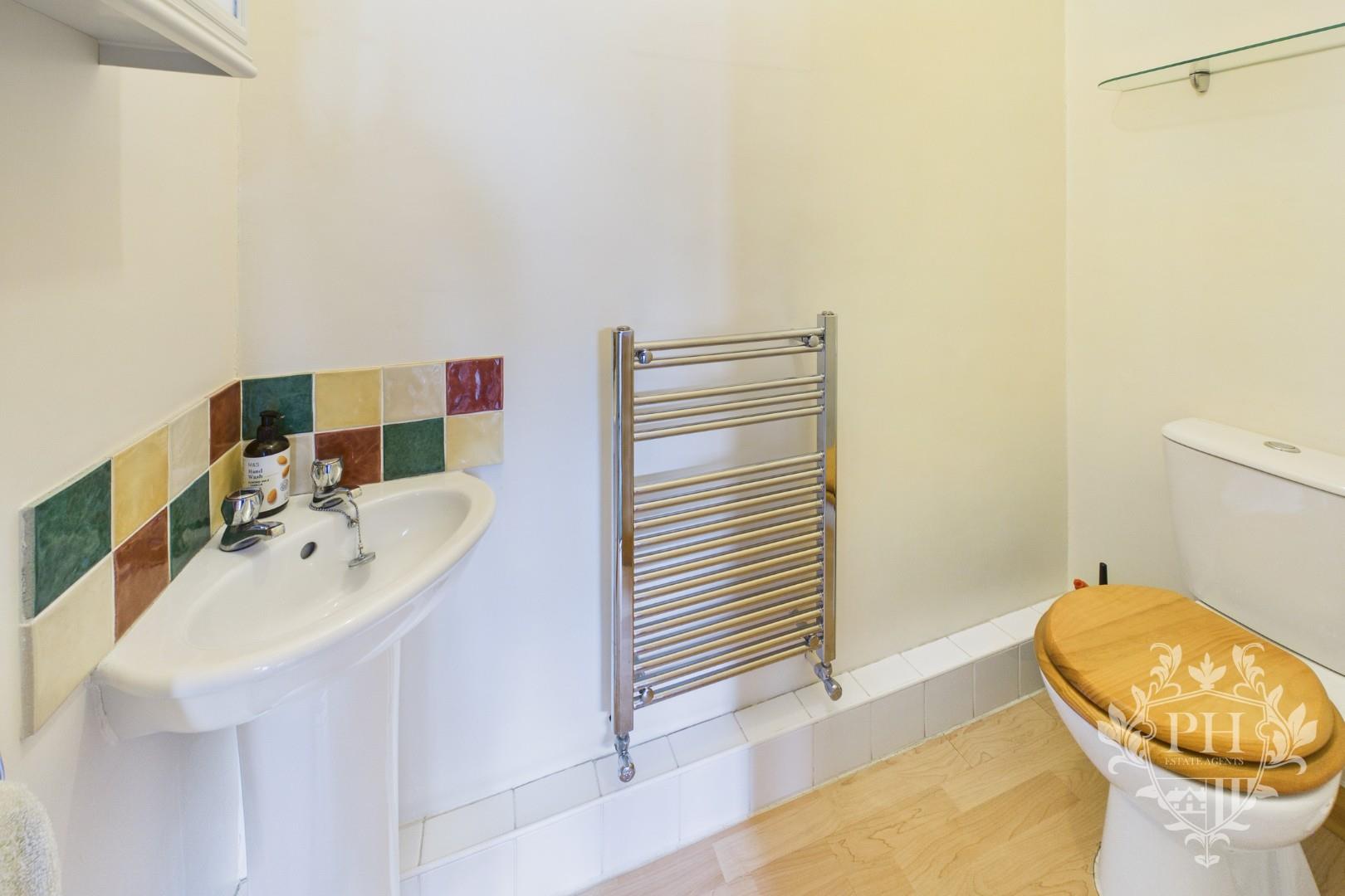 On the ground floor, there’s a convenient two-piece bathroom suite just off of the main hallway. This space includes a hand basin and a low-level toilet, both designed for everyday practicality. A radiator keeps the room warm and comfortable, making it both functional and inviting for guests or family members.